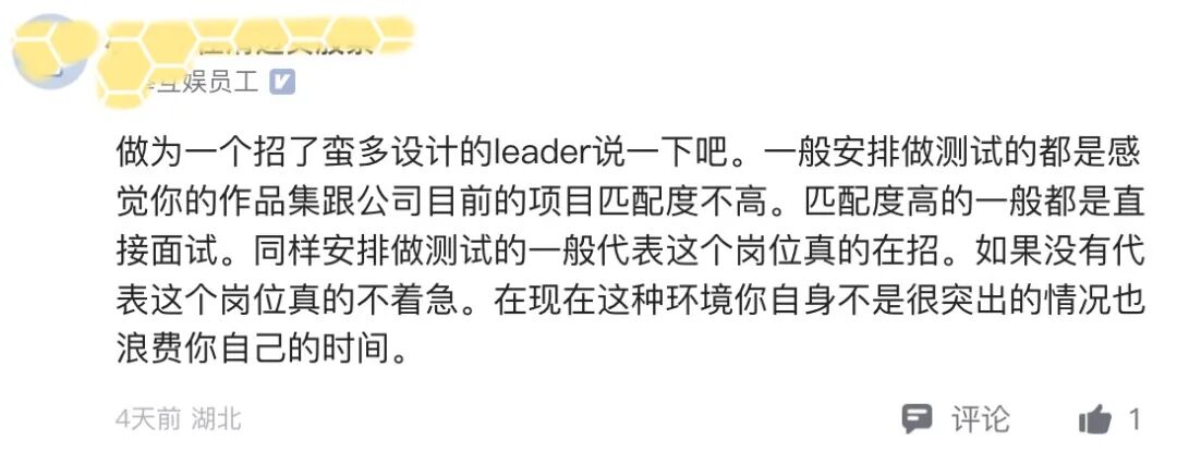 本身就是Leader角色的网友,也从另一个角度阐述了测试题的必要性:当作品集与公司项目匹配度不高时,应聘者很可能会被要求完成测试题。匹配度高的人就直接面试。测试题的存在也表示这确实是一个在招岗位。