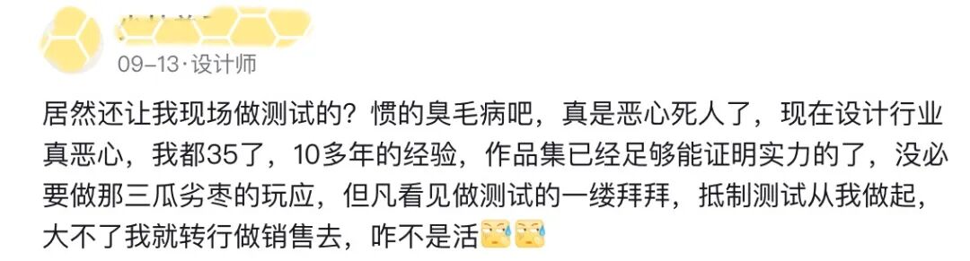 面试中要求资深设计师进行现场测试引发他的不满,他认为通过工作经验的展示,以及丰富的作品集,已经能够很好地展示自己的实力了。