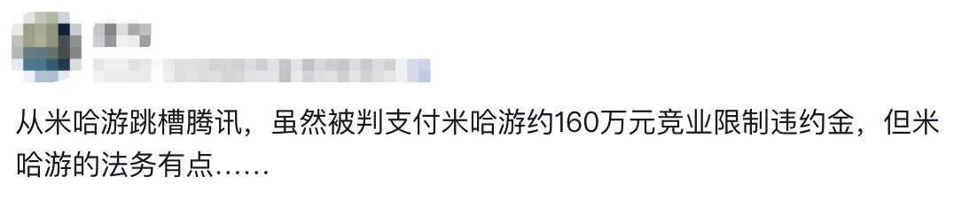 但他在离职后,没等到一年就去了腾讯游戏。米哈游因此把他告上法庭,要求赔偿160万元。