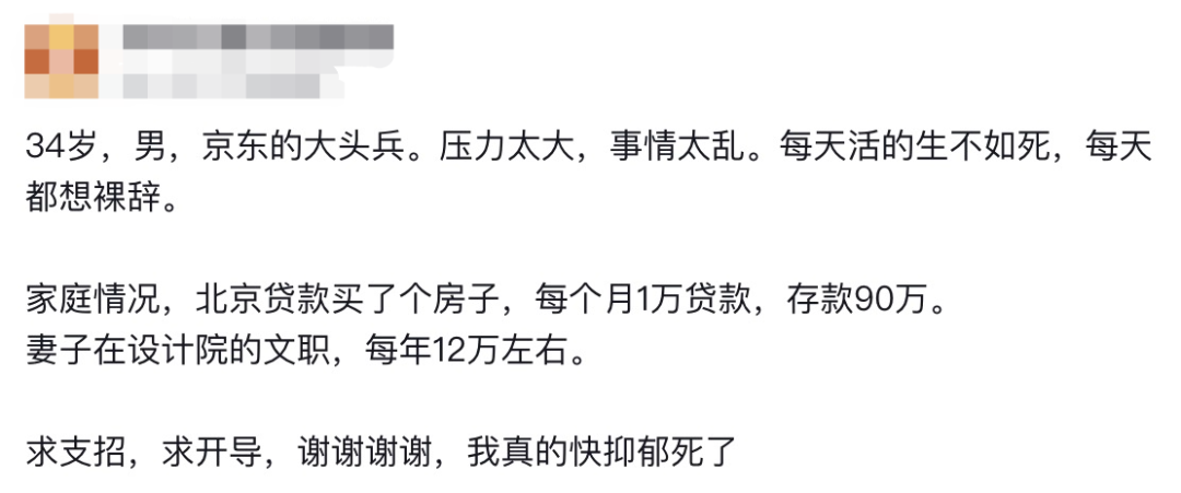 一位34岁的京东员工感到工作压力极大,每天在公司都很难熬。