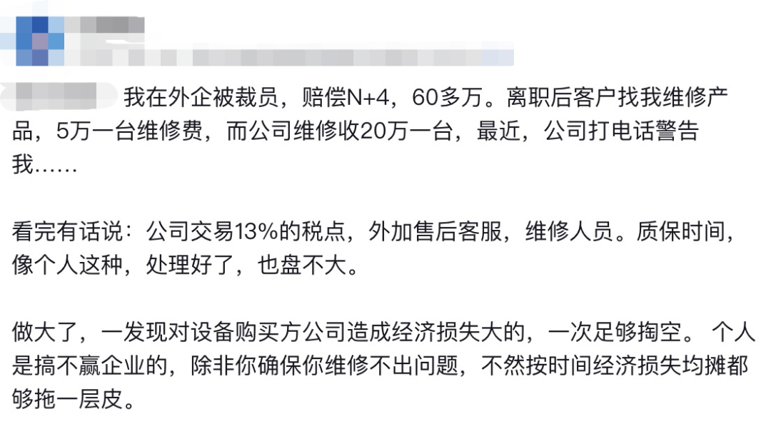 裁员后,他发现许多客户因不满公司昂贵的维修费用,私下联系他提出直接维修,每台设备报酬5万。