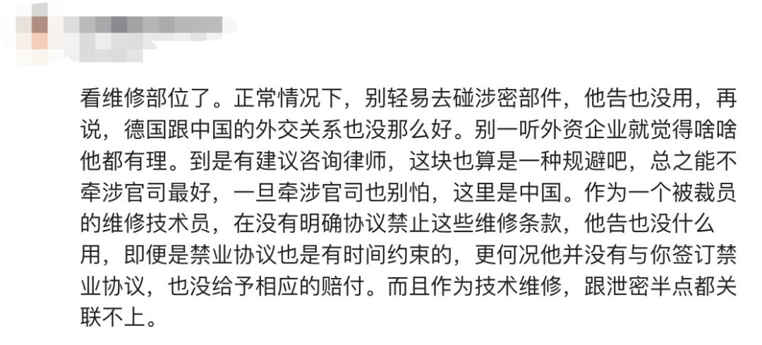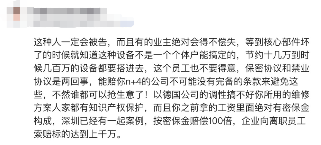 有网友对这位前服务工程师的处境进行了分析,认为他独立维修的行为可能会面临公司的法律诉讼。