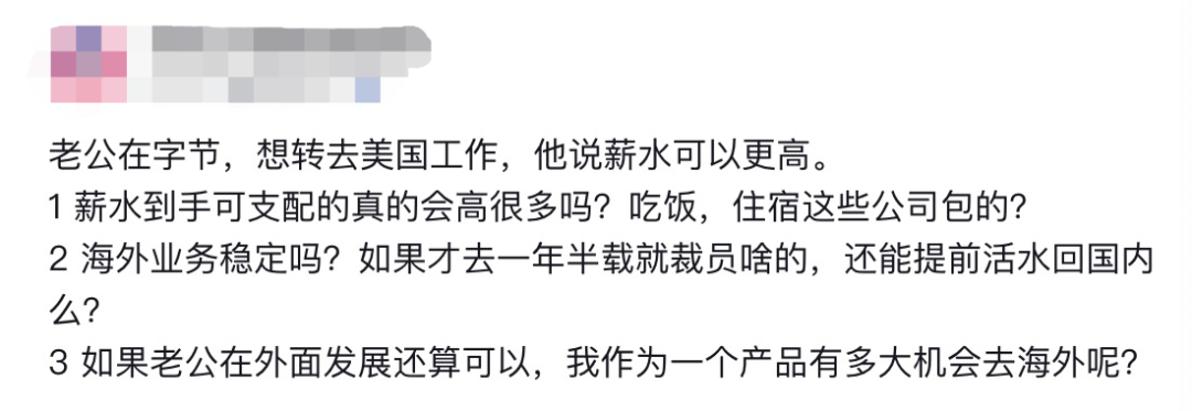 然而,她对此感到迟疑,担心在美国的生活成本和最终的净收入,并对字节在海外的业务稳定性持保留态度。