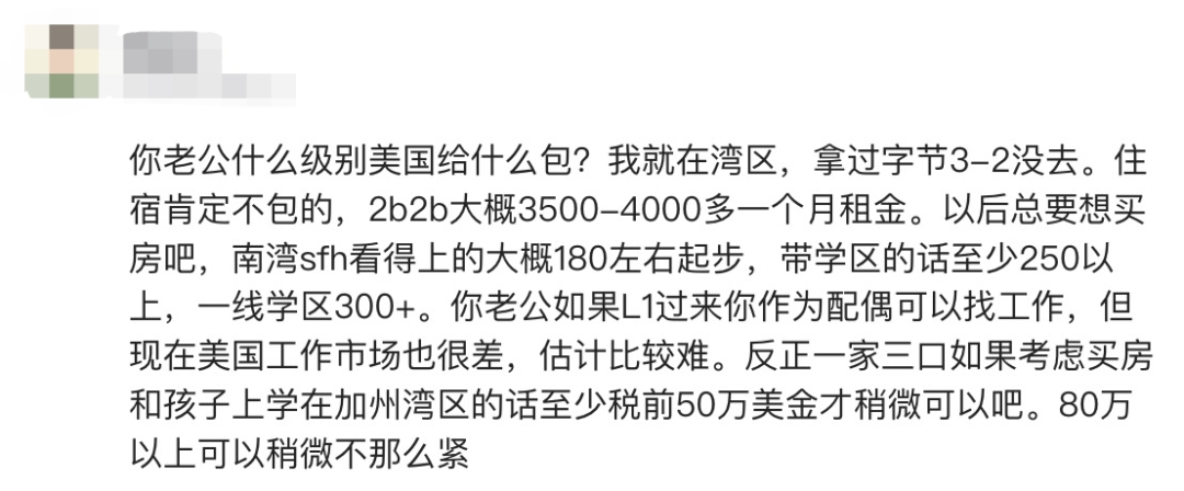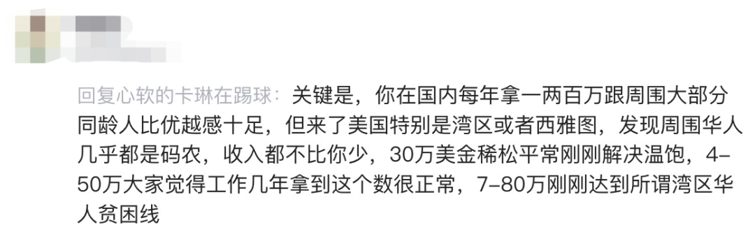 有网友说,在湾区年薪30万美金仅能满足基本需求,而年薪4至50万则是普通水平,7至80万则是达到所谓的贫困线..