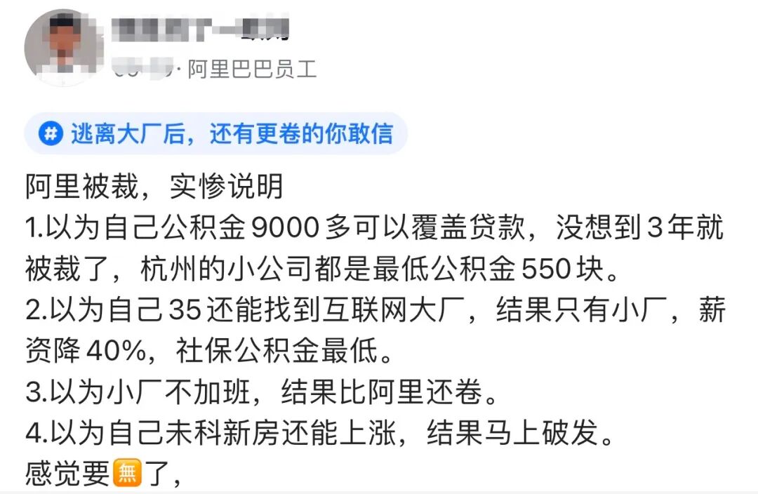 一位35岁从阿里离职的员工吐槽:没想到自己也遭遇了35岁危机,从大厂离职后只有小厂有工作机会,薪资降40%,社保公积金最低。以为小厂不加班,结果比阿里还卷!