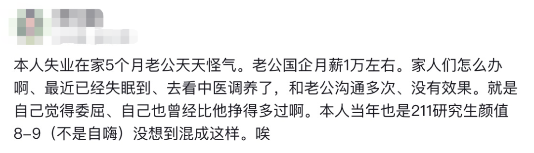 她的丈夫在国企工作,月收入大约一万元。但面对妻子的失业,他不仅没有提供任何安慰或鼓励,反而变得冷漠甚至嘲讽。