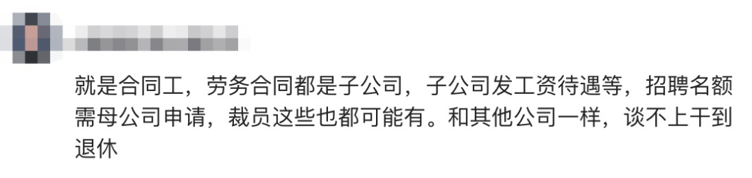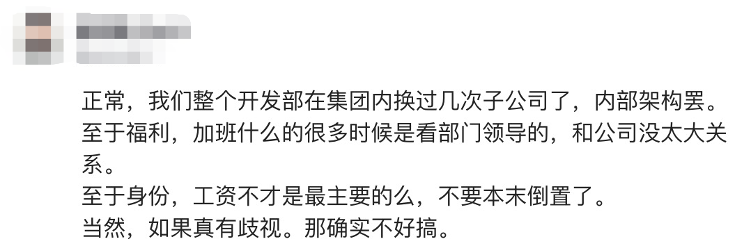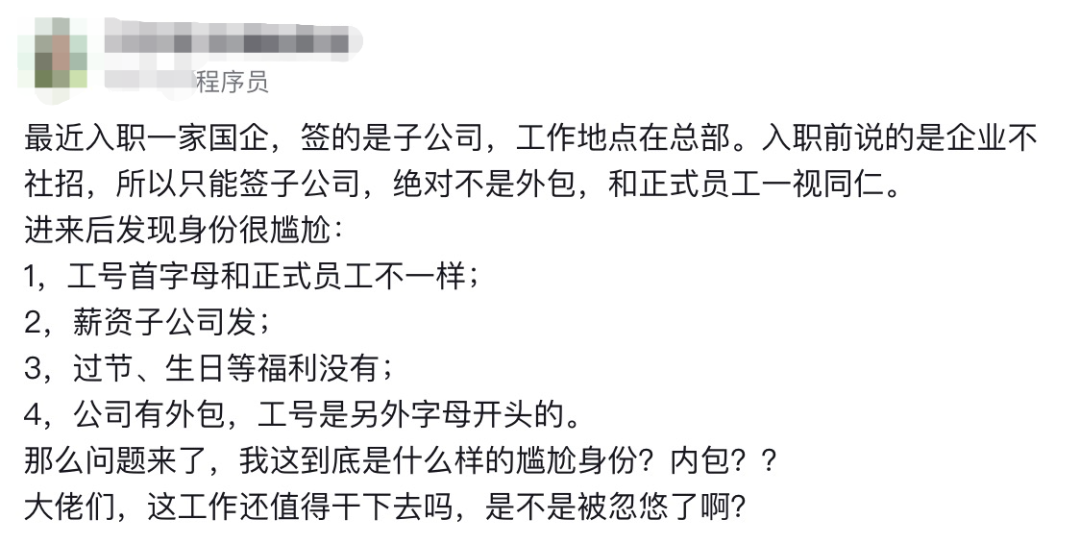 有网友提醒,他的情况可能属于劳务派遣,即工作关系和薪资福利由子公司处理,并被外派至国企总公司工作。这意味着他并非国企总部正式员工,而是同工同酬的“外派员工”。