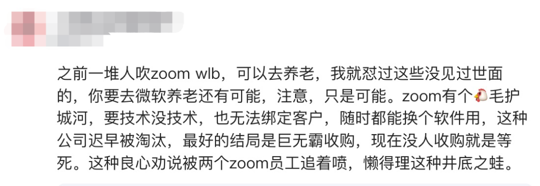 有网友认为,ZOOM本身没有自己的技术壁垒,也无法绑定客户,同类型的功能并没有什么独特性,换个软件一样用,再加上ZOOM本身是利用客观情况爆火的,用户积累量并不大,也不是公司内办公软件的主流,所以但凡传统办公类软件开发了相关功能后,很容易被替换。
