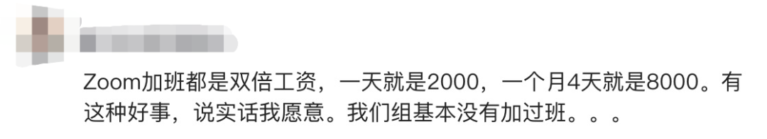 他们的理由是ZOOM周末加班至少是双倍工资...虽然说国内有部分公司还是很不规范,周末变相加班的情况也有,但周末加班双倍工资的政策在国内主流互联网公司都在执行了,谈不上有什么特殊照顾的。