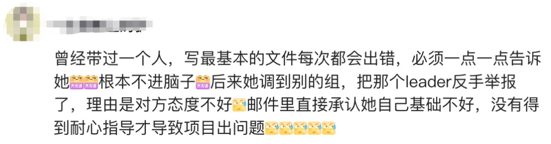 令人意外的是,当这名新人后来被调至另一团队后,她因为工作中的差错,竟然举报了那个团队的领导。称其态度恶劣,并抱怨自己虽然技能不足,但未得到应有的指导和帮助。