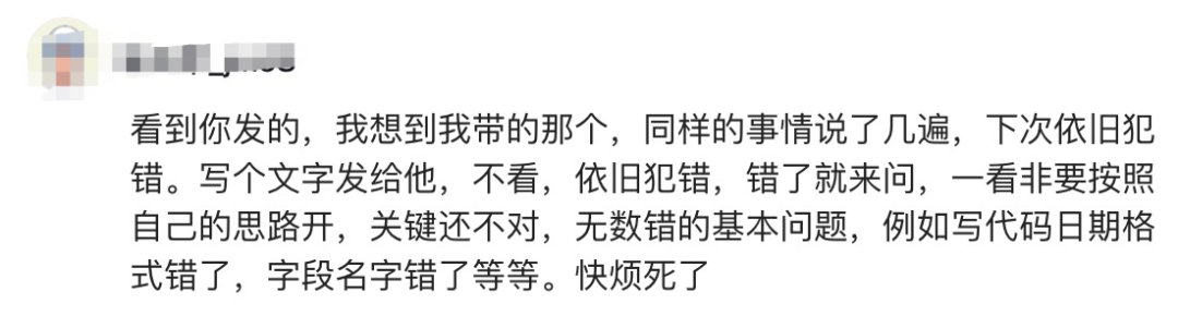 某互联网公司的员工分享了自己的经历:他曾经指导过一名新人,但这名新人在工作中频繁出错,且往往重蹈覆辙,让他感到非常疲惫。