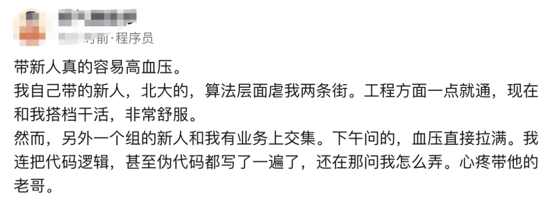 某大厂程序员吐槽,带新人真的容易高血压,自己带北大的毕业生,能力很强,一点就通,合作起来非常舒服。但和另一组的新人沟通业务时,各种出错,各种教不会,直接血压拉满...