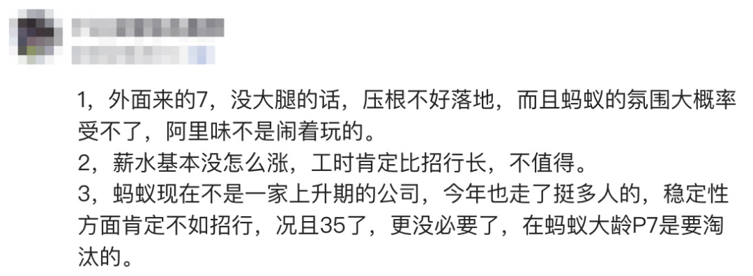 另一位与他处境相似的网友分享了自己的经历。作为35岁的中年职场人,他加入蚂蚁后,因无法适应高压的工作环境,在一年多后选择离职,转而加入家乡的一家中型企业。虽然薪资减少,但降低的生活成本和较低的工作压力让他感到更为舒适。