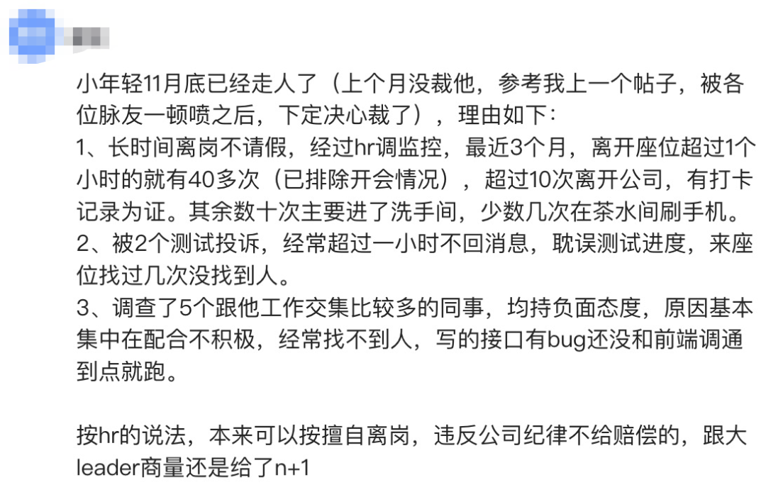 最后,小领导和HR沟通后,虽然本可以以“违反公司规章制度”为由直接开除这名员工,但还是争取了给他n+1的赔偿。
