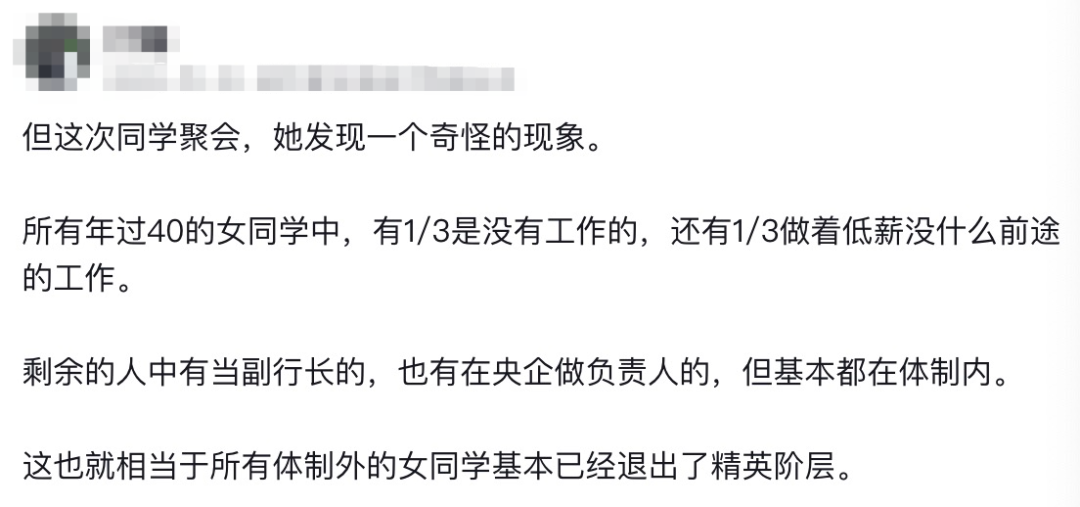 自己年过40的女同学中,大约三分之一的人选择了不工作,另外三分之一可能在做一些低薪且前途不明的工作。剩下的人要么在体制内有稳定的职位,要么已经成为某个国企央企的领导。