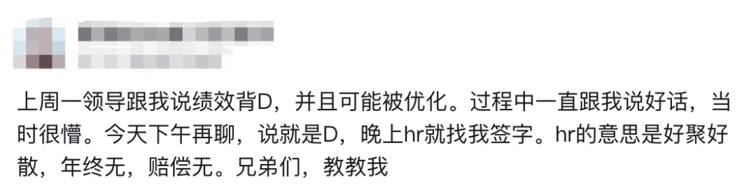 某大厂的一位数据工程师,上周被领导叫去谈话,说绩效背D,并有可能被优化,但领导的语气听着挺温和,还一个劲儿的说该员工好话。结果很快,HR就找到他,直接告诉他得走人,而且一分钱赔偿也没有,年终奖也没有。