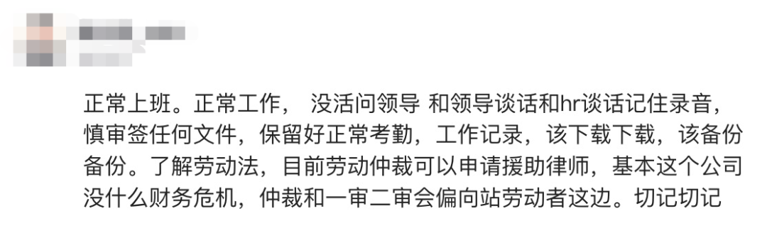 坚持正常上班和完成工作任务,如果任务不明确,及时和领导确认。和领导、HR的交流最好录音,以备不时之需。签署任何文件前要认真审阅,确保自己的权益不受损害。