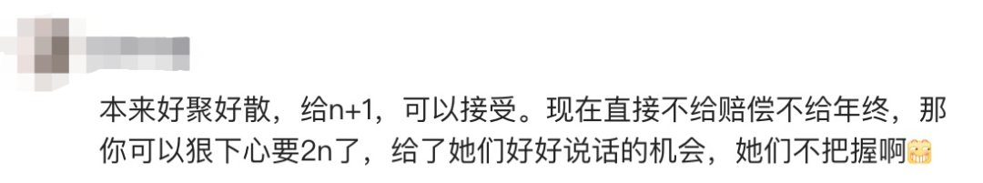 那个大厂员工后来又被HR叫去谈,HR提出给他额外一个月工资,同时这半个月不用来公司了。员工挺纠结的,一方面觉得赔偿太少,想争取n+1;另一方面,他还盼着年终奖。