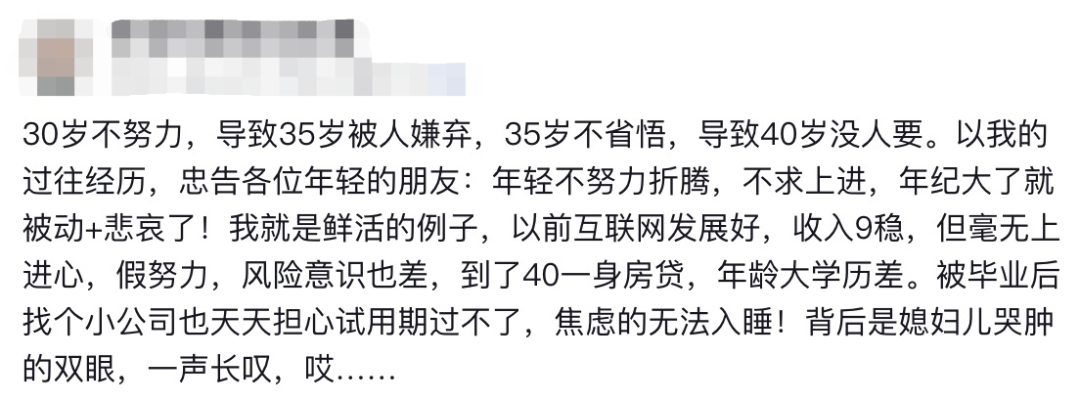 某位前互联网大厂员工,他现在40多岁,曾在30多岁时享受着大厂的安逸和稳定,却没有意识到自己逐渐落后的风险。到了35岁,他的职业发展已经开始受到限制,但他依旧没有引起足够的重视,缺乏上进心,工作时经常摸鱼,直到40多岁被裁员,他才真正意识到自己的不足和过去的错误。