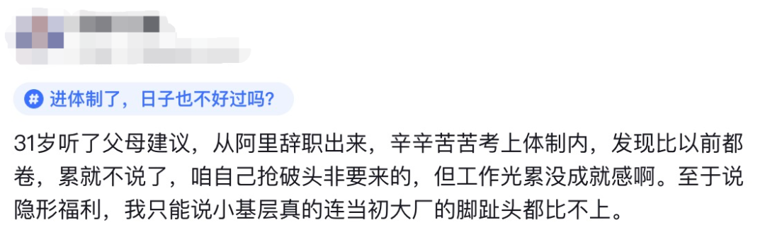 某阿里的产品经理,31岁,听从了父母的建议,从阿里辞职,考上了体制内的公务员。这本是令人羡慕的上岸,但工作了一段时间后,他发现这份工作比以前在阿里还“卷”,工作累不说,也没有获得相对应的经济回报,更别提别的福利待遇了,最后总结,小基层真的连当初大厂的脚趾头都比不上...