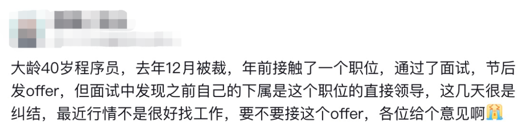 一位40岁的大厂程序员,去年底被裁了。年前终于找到个新机会,面试也过了,喜滋滋等offer,结果发现,新岗位的直接领导竟然是自己以前的下属。这让他挺纠结的。毕竟现在这市场,找份工作不容易,自己年纪也一大把了,拒了这个offer,下一个更好的机会在哪儿也不好说。