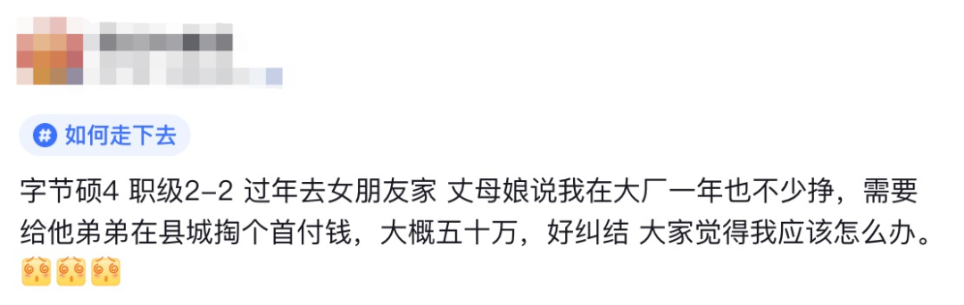 有位在字节跳动工作的朋友,今年春节是去女友家过的,没想到碰上了个棘手的情况,他未来的丈母娘知道他在这么大的公司上班,自然而然认为他赚了很多钱,竟然开口想要他拿出50万,说是为了帮女友的弟弟在县城买房付首付款。
