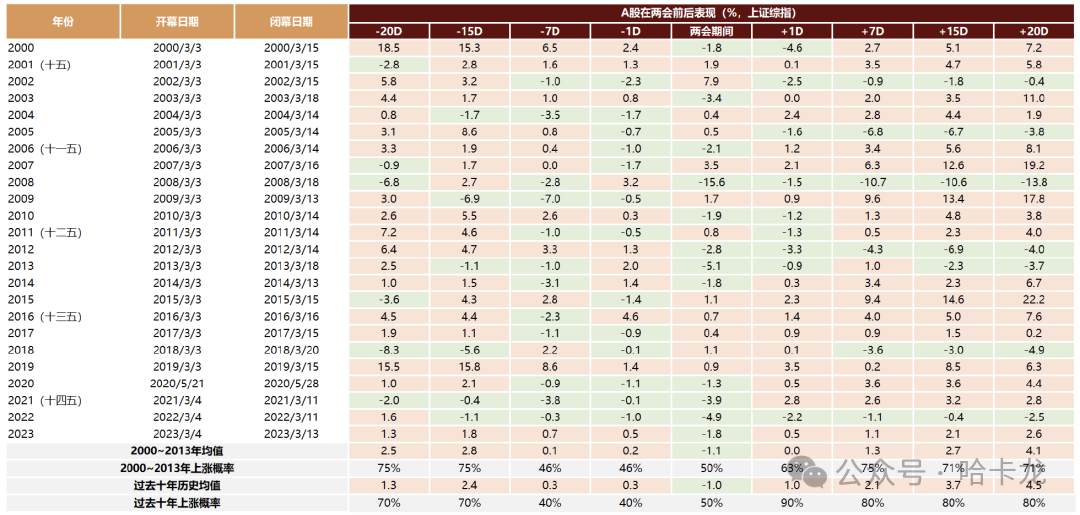 拉长时间,从2000年以来的情况看,两会期间A股市场大多呈现较积极的表现。上证指数在两会前后20个交易日的平均涨幅分别为2.5%/4.1%。