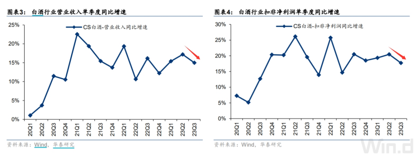 经销商销售数据不行,反应到酒企,就是营收的下滑。大家看下图,从21年开始,白酒的营收同比就持续在下降。
