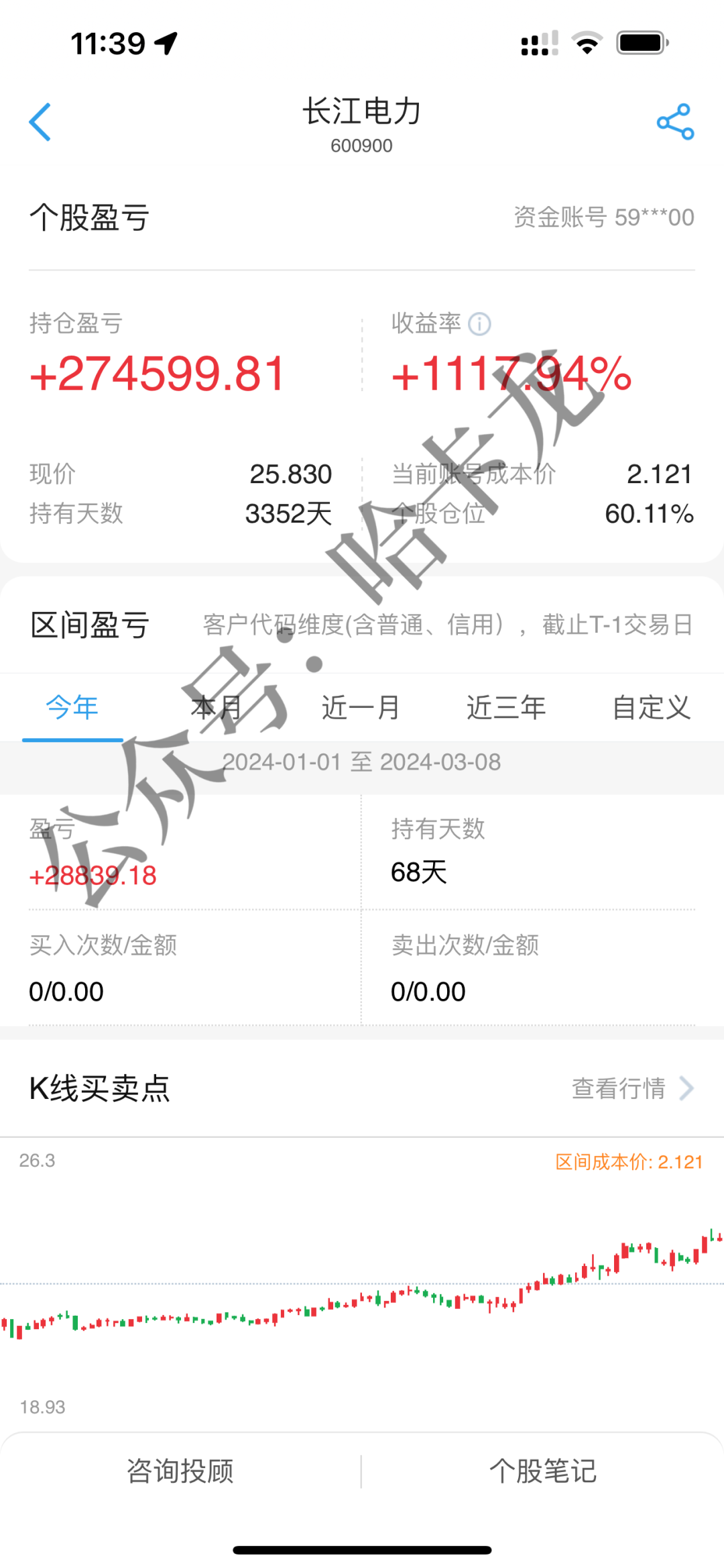 说起十年十倍,我手里倒是也有一只持有3000多天的标的,叫长江电力,十年11倍!但这完全是靠着运气赚的钱,因为这账户是最近我看长江电力一直涨才想起来的,要不然早就忘到一边儿去了。