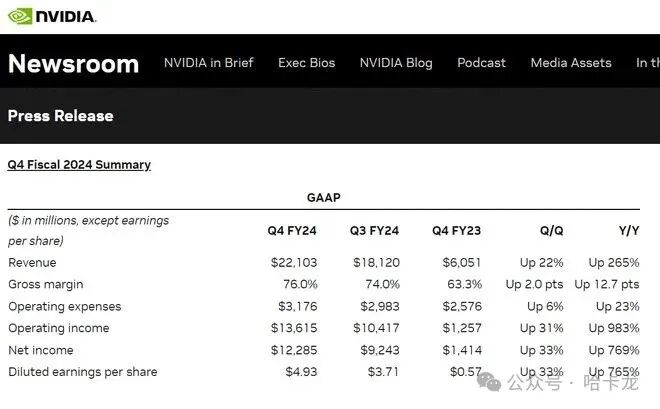 关于AI,这两天全球都在关注英伟达的业绩,四季度净利润123亿美元,比去年同期的14.1亿美元暴增769%。其中,数据中心收入占比高达83%。