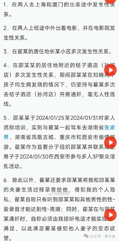 事情的起因是邵某某和公司领导翟某在出差过程中发生多次性关系,在两人上班途中还去看电影,并且在电影院发生关系。翟某甚至在北京组织聚众淫乱活动,要求邵某多次和多名男性发生3P、4p关系。