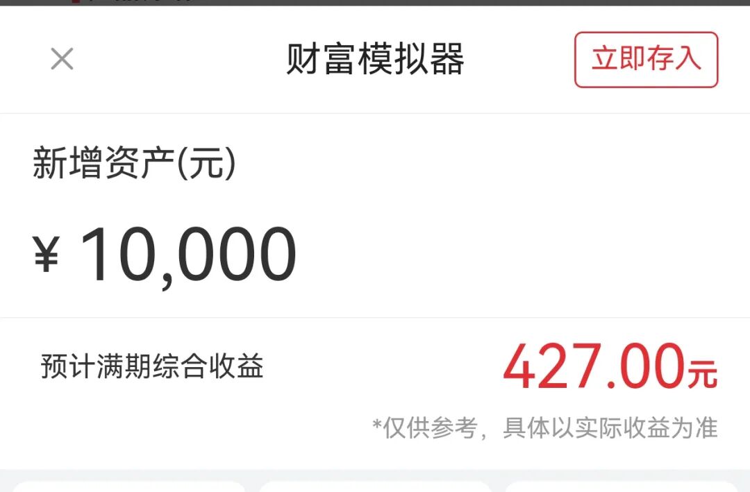 我们以1万块为例输入测试,会发现到期收益是427块。