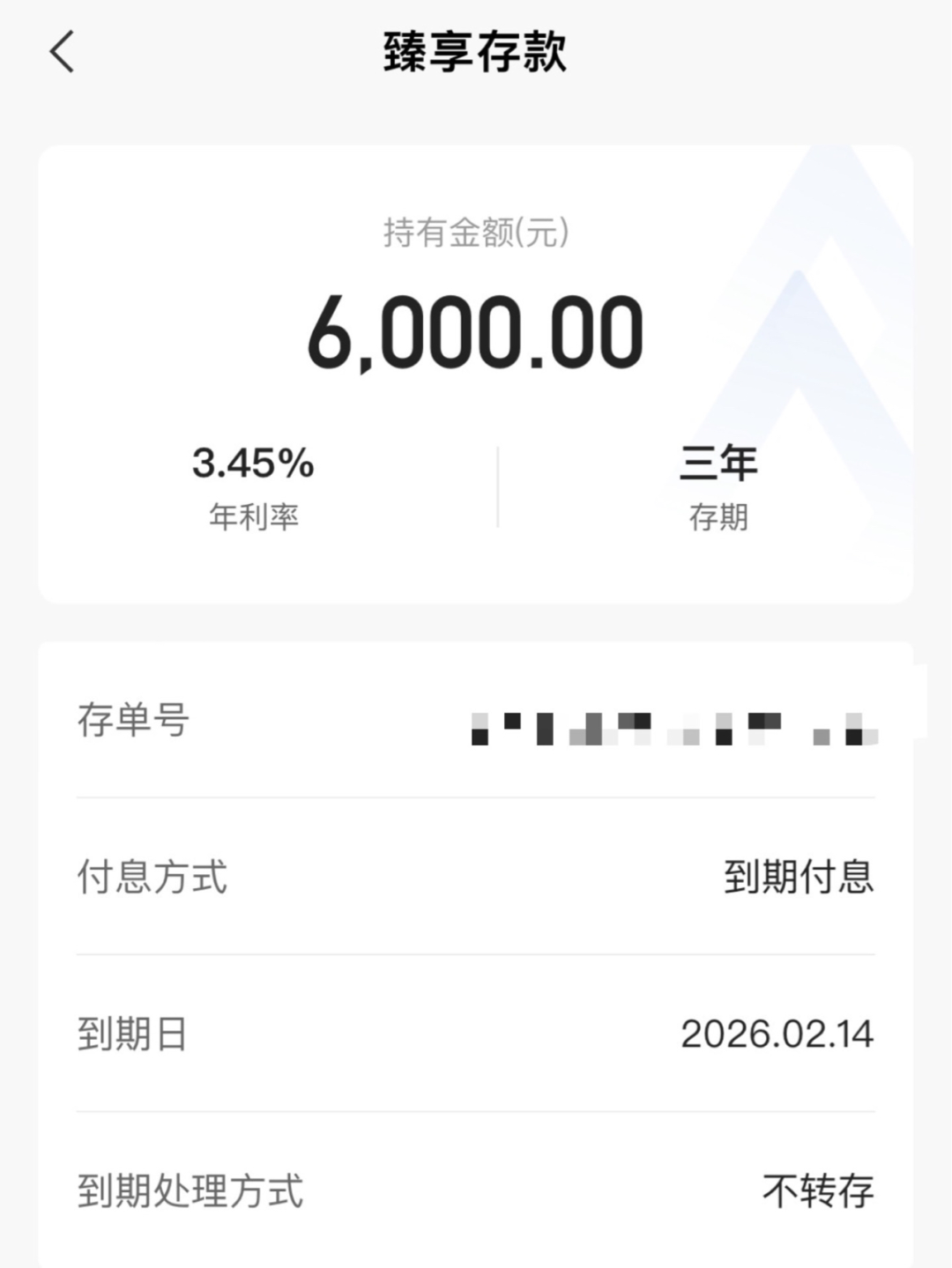 去年2月13号存入一笔一年期的定期存款,今年2月14号取出来了,思来想去,怎么样都是存钱,不如锁定一个高利率,索性直接存了三年的定期。