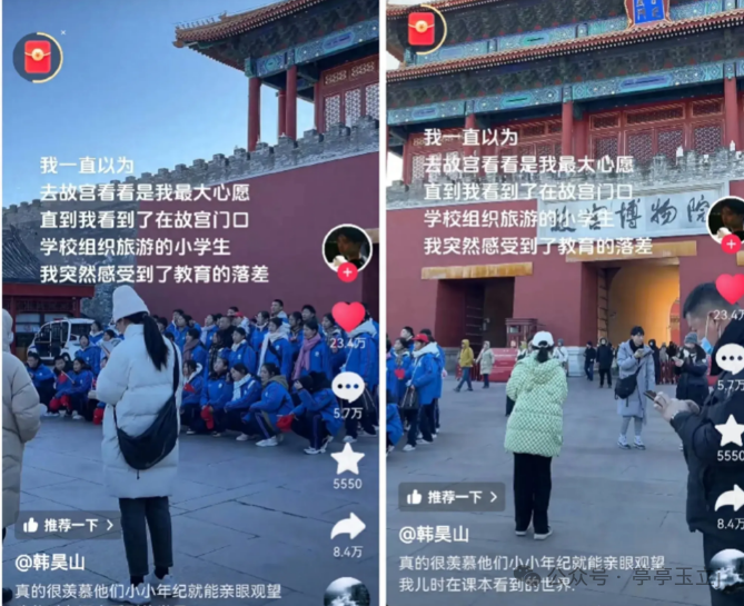 这就是现实,有时候残酷无比。我们常说,每个人的人生轨迹都是不一样的,不能拿自己的人生去要求别人,也不能以自己的眼光去评判别人。但是,在这个日渐浮躁的社会中,越来越多的人开始忘记这一点,他们总是将自己的人生经历当做标准,去衡量和评判他人。前几天,一则新闻引起了不小的轰动,一所学校组织的小学生去故宫参观,竟然成了众多网友热议的焦点。对此,很多网友纷纷发表自己的看法,认为教育资源的不平衡才是最大的问题所在。一些网友表示,这样的事情并不罕见,在一些发达的城市里,研学旅行早已经成为了家常便饭,孩子们可以走出课堂,走进博物馆,这样的研学之旅不仅能够丰富孩子的知识,还可以拓宽他们的眼界。
