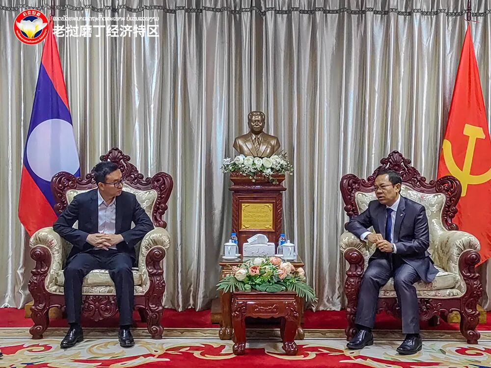 △老挝磨丁经济特区管委会主席周昆(左)与老挝琅南塔省委书记康莱·西巴瑟(右)认真探讨
