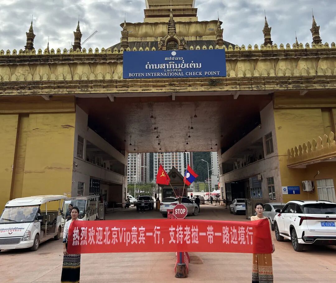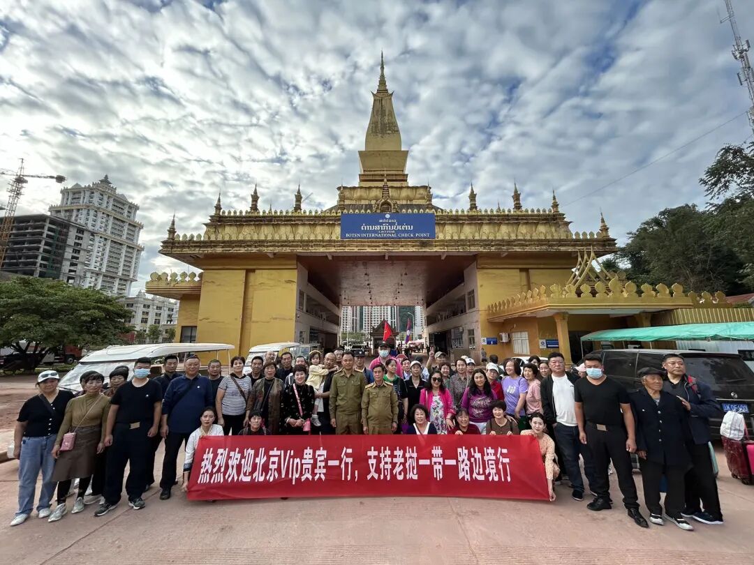 老挝旅游公安与边境游团队在磨丁口岸旁合影