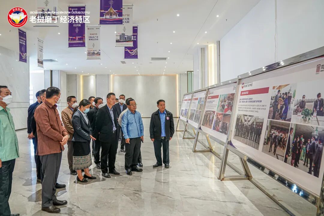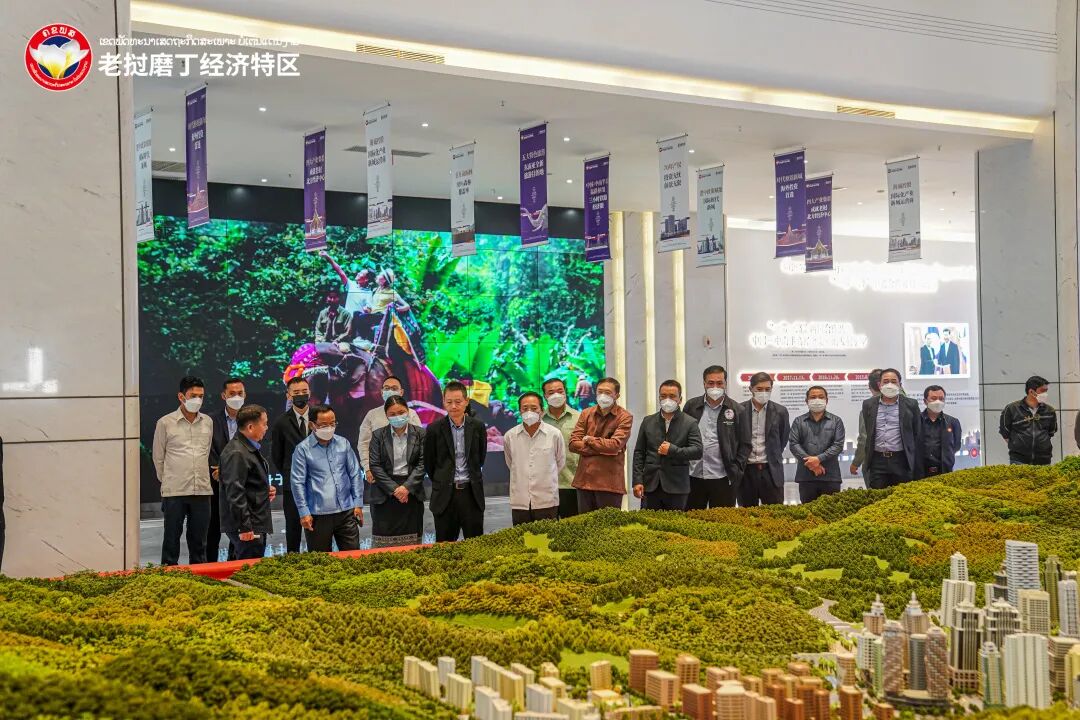 坎潘·蓬玛塔书记一行重点参观了磨丁经济特区城市规划展示中心,现场工作人员详细介绍了磨丁产业发展规划,并就目前开发现状作了简要汇报。工作人员介绍到,自2015年中老两国正式签署成立中老磨憨-磨丁经济合作区以来,磨丁经济特区在老挝中央和琅南塔省政府的关怀指导下,建设成果喜人,发展日渐向好。今年下半年来,特区在招商上重点发力,努力拓展特区招商渠道,为特区四大版块发展丰富产业内容,加速合作落地,目前在开发建设、贸易投资、产业引进等方面有了显著成效,当下虽受疫情封关影响,特区开发集团仍然有信心将磨丁建成、建好。