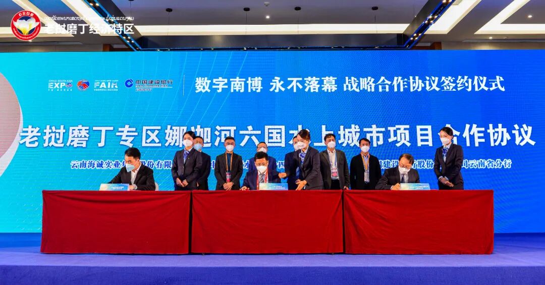 此次磨丁参展南博会大放异彩,不仅在参展期间吸引众多企业关注,更是在经贸合作上收获颇多,签约不断。21日下午,由中国一南亚博览会执行委员会和中国建设银行股份有限公司云南省分行共同举办的“数字南博,永不落幕”战略合作协议签约仪式上,老挝磨丁经济特区与中国建行云南分行及中国水电十四局共同签署了《老挝磨丁娜迦河六国水上城市项目合作协议》,为特区文旅配套城建再添助力。