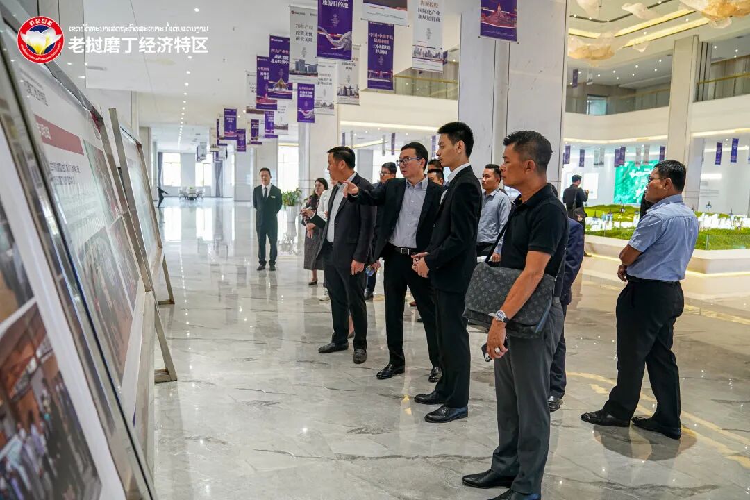 当天,双巴瑟.达拉翁主任一行人抵达磨丁经济特区后,在接待领导陪同下前往磨丁城市规划展示中心进行参观。现场工作人员从磨丁区位、政策优势、四大产业布局及特区未来发展规划等多个方面为其详细介绍。管委会主席周昆向双巴瑟·达拉翁主任一行提到:老中铁路通车一年来,特区发展受到老挝中央的重点关注,并从政策面和执行面均予以落实,为特区复工复产打下了牢固基础。