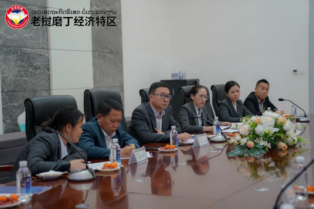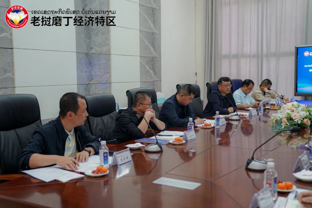 参观结束后,昆明市商务局代表团与磨丁特区共同召开了座谈会议,双方就磨中老磨憨-磨丁经济合作区基础设施互联互通、双边产业发展、项目合作、政策争取等问题展开讨论。会议上,磨丁经济特区管委会主席周昆向昆明市商务局代表团汇报了磨丁特区整体发展建设情况,详细介绍了特区功能片区划分、产业布局建设、招商引资工作及磨丁-磨憨联动发展等内容。周昆表示:随着两国口岸恢复互通,磨丁将积极开展口岸改造提升工作,推动特区围网工程建设,加快物流陆港打造,并将协同磨憨片区加快人货通关速度,招商引资方面也会同磨憨展开合作,借力昆明市托管契机,吸引更多优质企业到合作区落地生根。