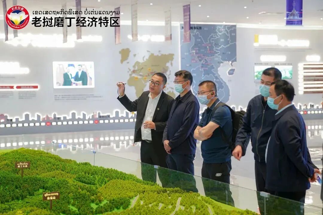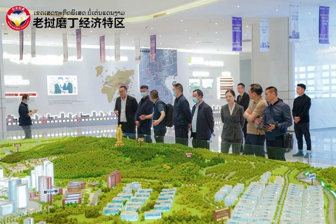 随后,代表团一行乘车前往磨丁经济特区城市规划展示中心进行参观,现场负责人依序向代表团介绍了磨丁特区近年来的发展历程、规划建设、产业布局、招商进度及老挝相关政策扶持。听取完介绍后,刘亚迅对磨丁特区整体的发展表示认可和肯定,并指出磨憨与磨丁是两国跨境经济合作的重要载体,两地在发展前行的道路上要紧密交流,发挥好优势互补协同发展,努力作好两国边地社会经济发展的示范作用。