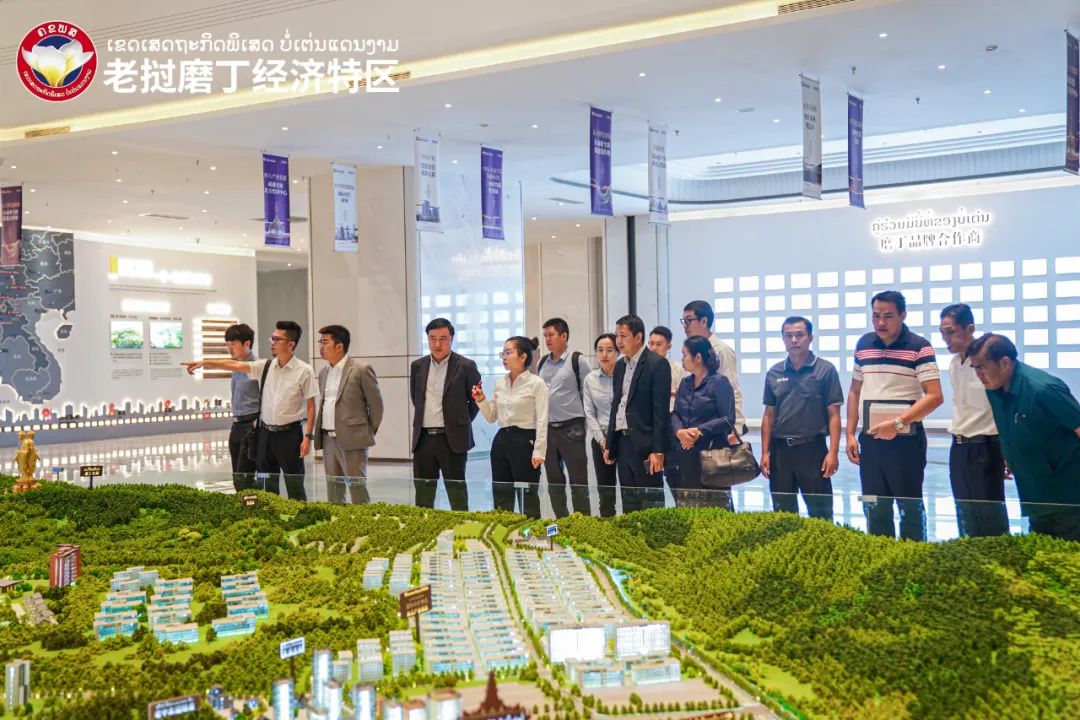 来访代表团一行于4月2日抵达磨丁经济特区,3日开始正式走访,代表团一行对特区规划展示厅、物流LICD查验货场、北部国门片区及两湖文旅片区及磨丁景兰免税店等产业地标进行了走访考察。4月3日上午,工作组一行抵达磨丁特区规划展示中心参观,在磨丁招商局工作人员的介绍下,代表团一行对磨丁特区近年来的发展建设、产业规划、招商引资及口岸物流园区建设有了详实了解,并对疫情影响下磨丁坚持发展取得的成果予以认可。