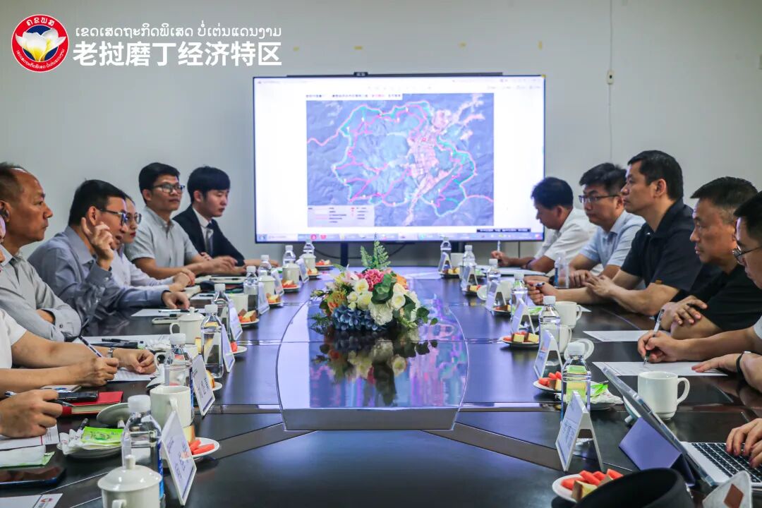结束实地调研后,王刚市长一行与磨丁经济特区就口岸开发建设、园区经济打造以及中老铁路沿线产业发展进行交流。