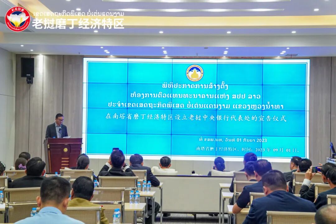 9月1日,老挝央行磨丁经济特区代表处举行揭牌仪式,央行总行副行长罕娇·拉玛尼奥,乌多姆赛省北部分行代理行长森塔伟·西哈丰,磨丁经济特区管委会主席周昆等领导出席揭牌仪式并发言,央行各职能司,计划投资部经济特区促进办,乌多姆赛省北部分行相关处室,南塔省政府,南塔省经济特区管委会,以及南塔省多家银行,银行驻磨丁服务点,磨丁相关管理部门等相关负责人参加揭牌仪式。