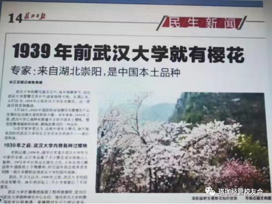 ———武汉大学后勤集团高级工程师黄德明,曾担任过武汉大学园林绿化中心主任。他对武汉大学的樱花栽培史比较熟悉。黄德明介绍,1937年7月出版的《武大植物园木本植物图说》一书明确记载,1937年之前的武大珞珈山校园与武大植物园里,栽种有樱桃,且数量不少。黄德明透露,1939年侵华日军栽种在武汉大学校园内的28株日本樱花以及1972年日本政府赠送给武汉大学的日本樱花,均于上世纪末、本世纪初死亡殆尽。