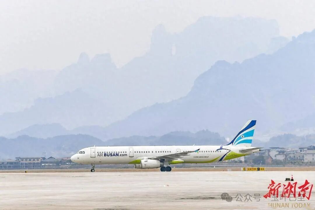 2月28日,一架从韩国釜山起飞的空客321飞机缓缓降落在张家界荷花机场。