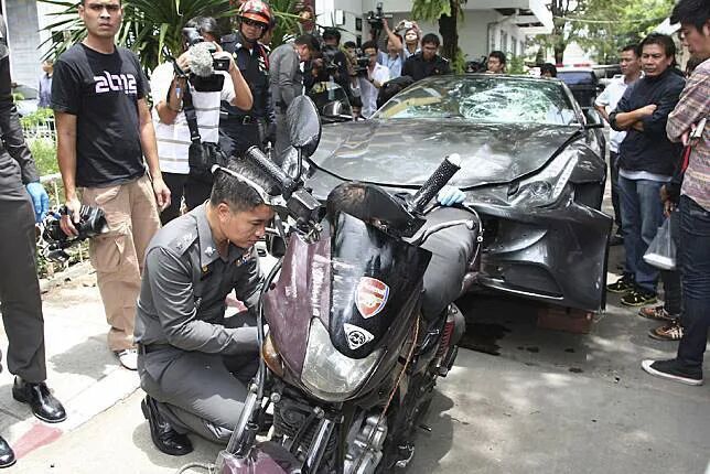 2012年9月3日,一辆银色法拉利在泰国主要公路“苏坤蔚路”上呼啸而过,撞翻了一辆警察机车,车上的警察当场毙命,而法拉利的司机却逃离了现场。这起交通事故很快就被破案,法拉利司机醉驾撞死人还逃逸,按照法律应该被迅速逮捕并提起公诉。但是直到今天,肇事司机都没有得到惩罚,甚至从来没有被拘留过一天。