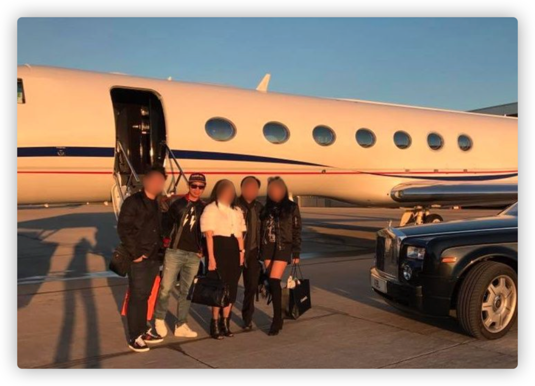 他搭乘着私人飞机,在世界各地参加上流社会的活动。住在3万美元一晚的度假村,出席“红牛”赞助的一级方程式赛车比赛,还晒出自己和各种豪车的合影……