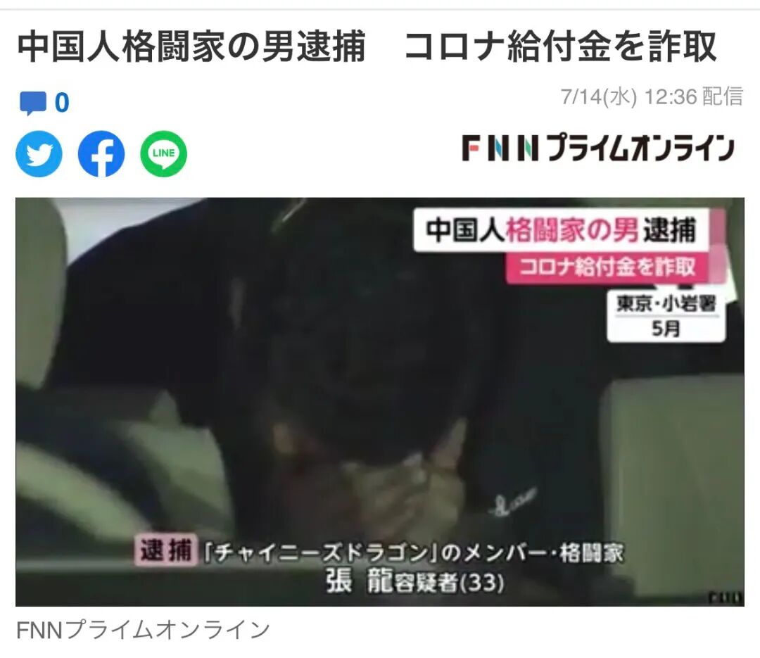 7月14日,日本一家电视台播出了这样一则新闻:日本华人第一黑帮“怒罗权”的一名头目被捕,他名叫张龙,因为持有大麻遭到警方搜查,结果发现他拥有9张他人的身份信息材料,用这些伪装成个体户,骗取了日本政府600万日元(约35万人民币)的疫情补贴。