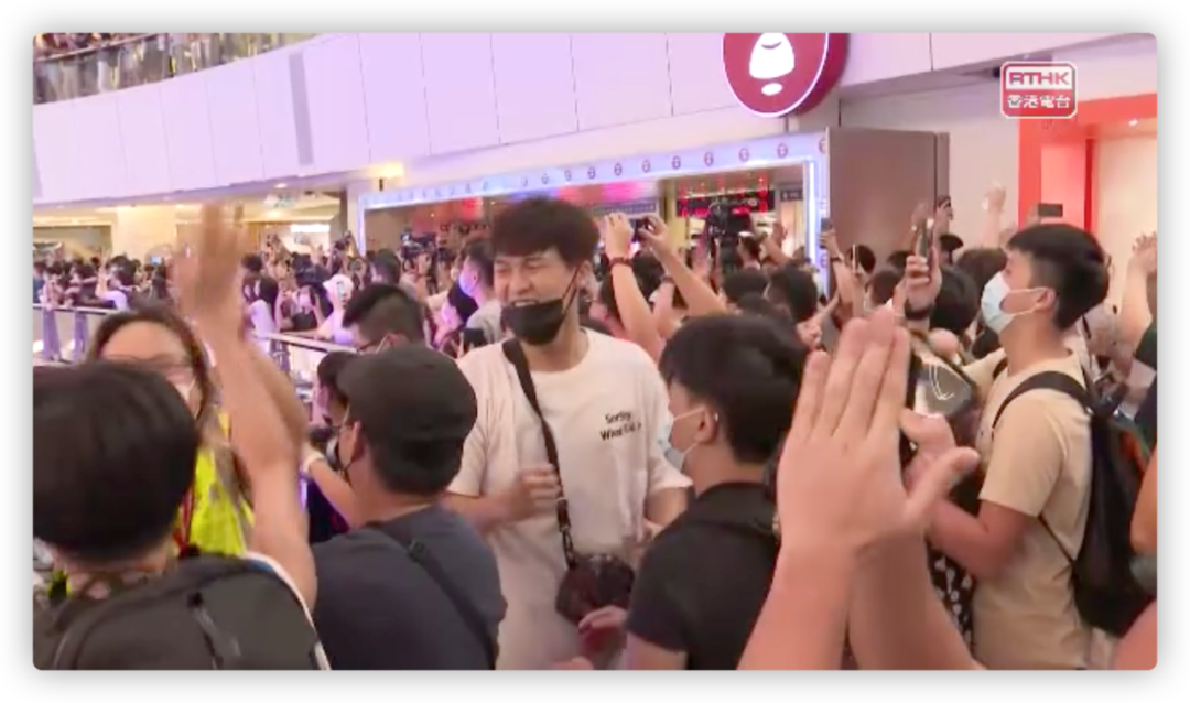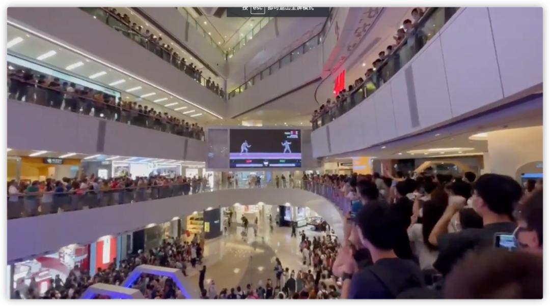 在香港观塘的一个购物商场里,挤满了观看比赛的人。人们跟着张家朗的每一次得分而欢呼,又随着他的每一次失分而惋惜,当张家朗脱下头盔,庆祝夺冠的时候,整个商场陷入了庆祝的海洋。
